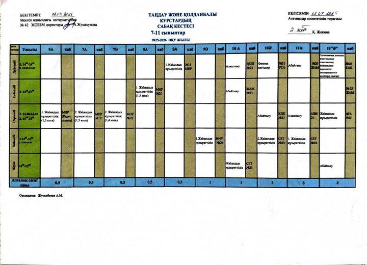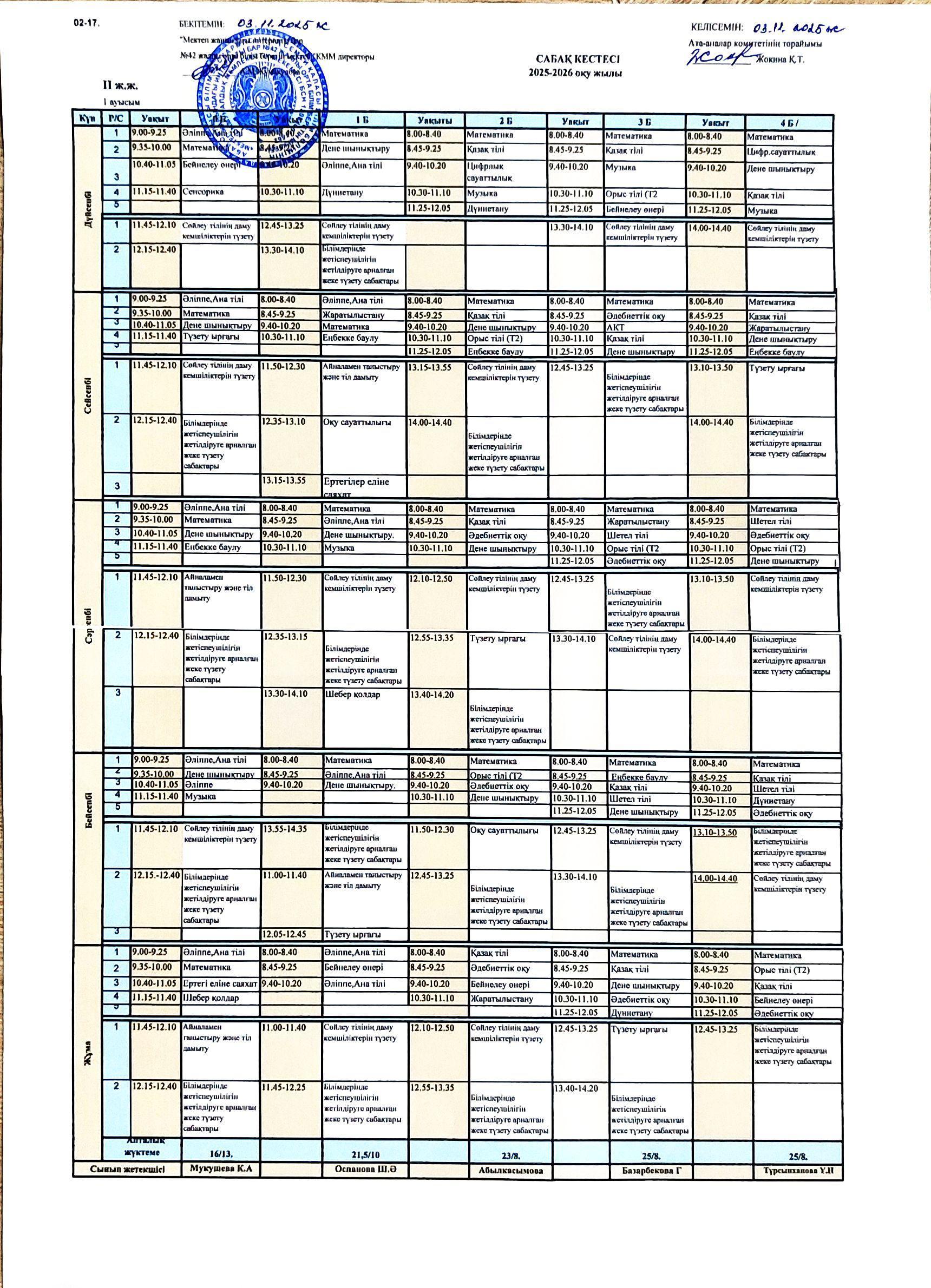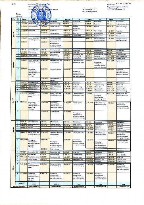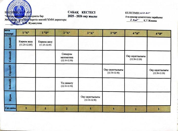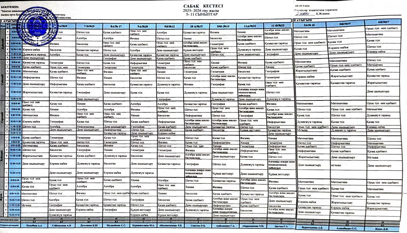 2025-2026 оқу жылының сабақ кестесі