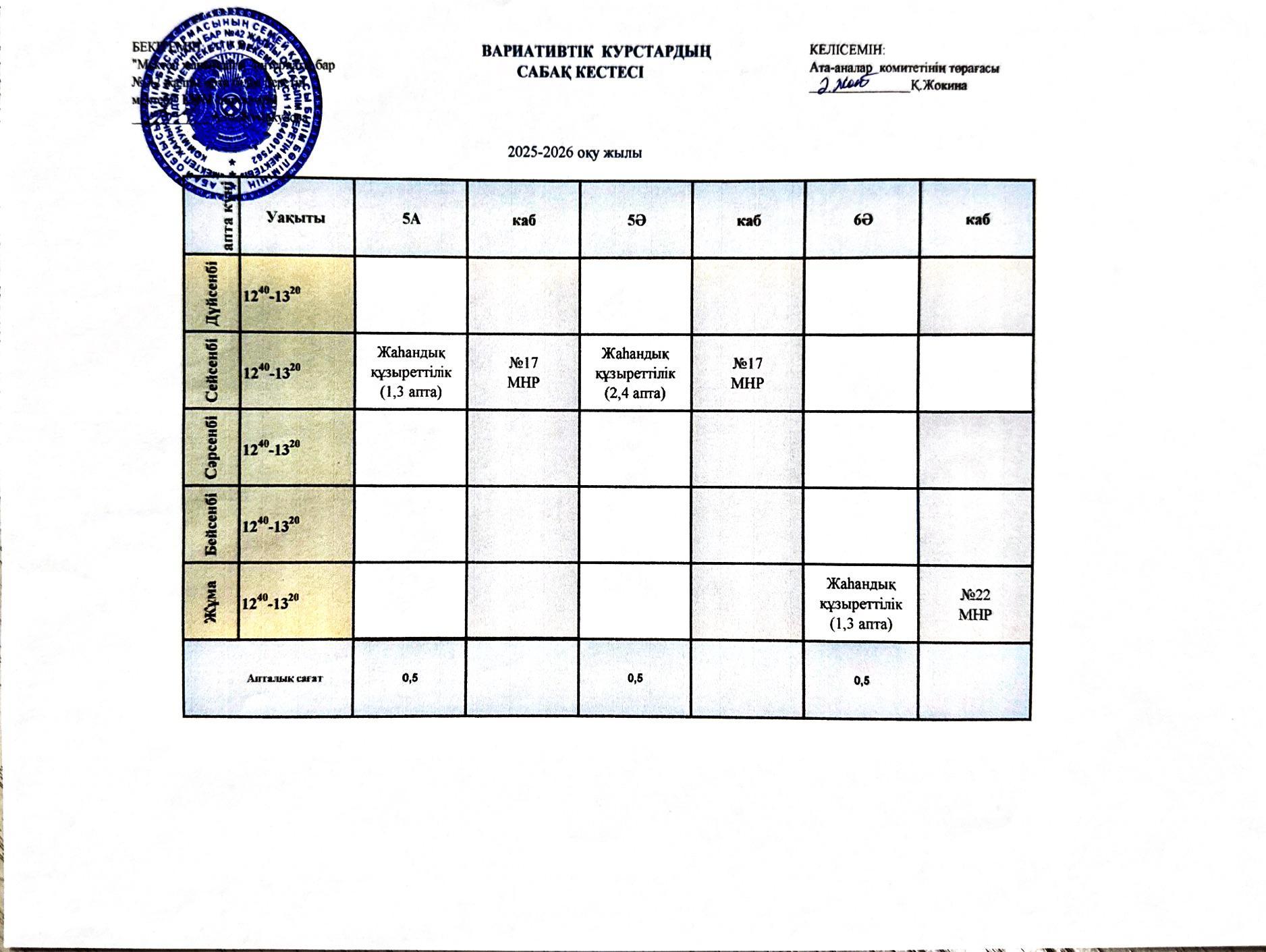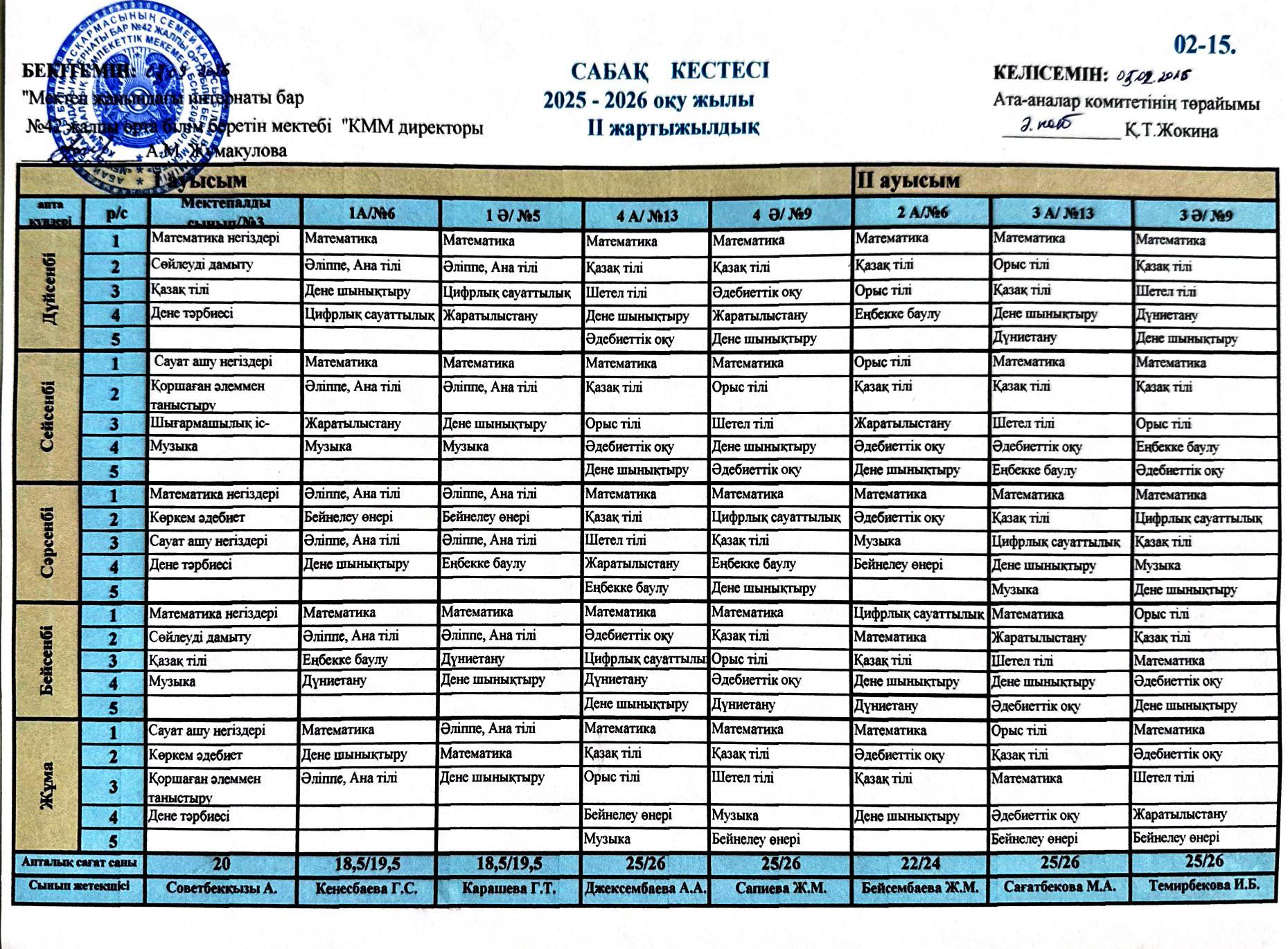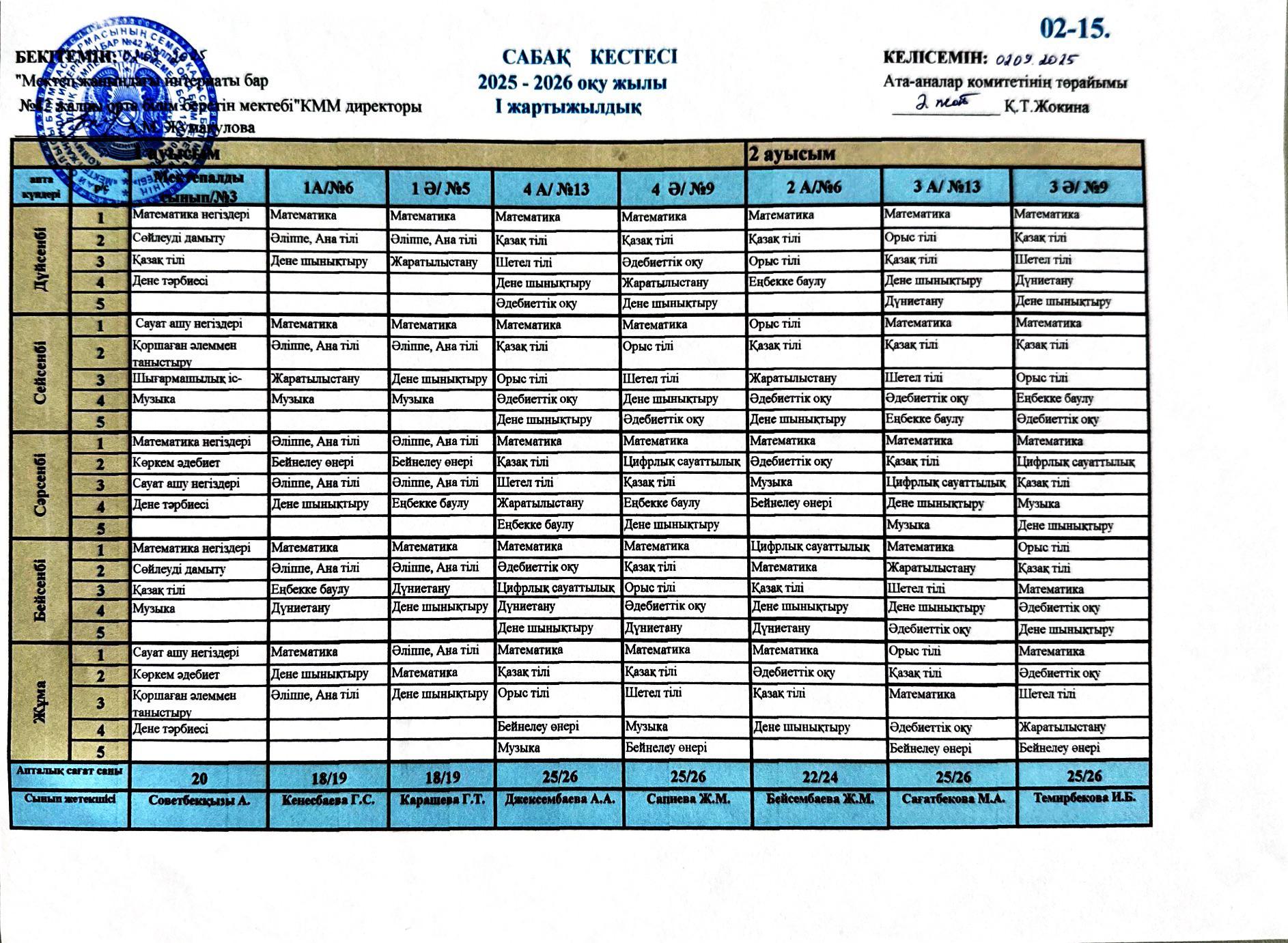 2025-2026 оқу жылының сабақ кестесі