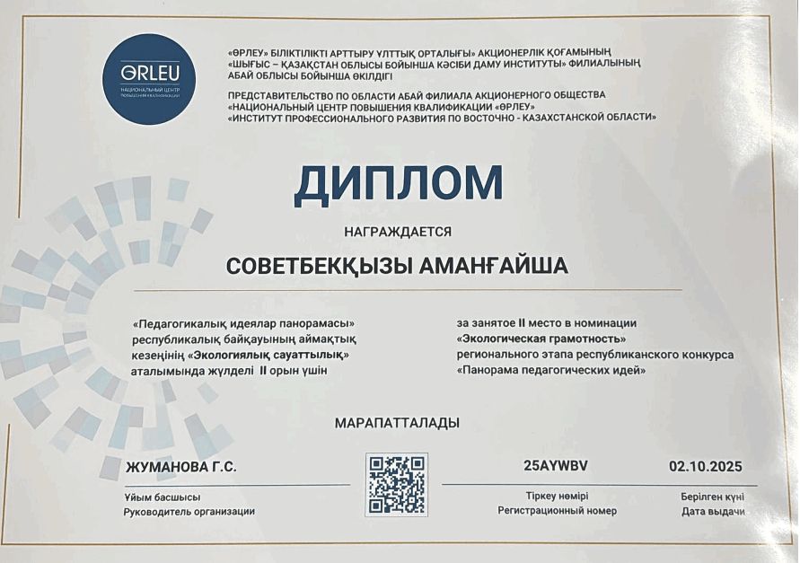 Педагогтердің кәсіби өсуін ынталандыру, инновациялық тәжірибесін зерделеу және тарату мақсатында «Педагогикалық идеялар понорамасы» республикалық байқауының аймақтық кезеңі қыркүйек айының басында өтті. Осы байқаудың «Экологиялық сауаттылық» аталымында мектебіміздің мектепалды даярлық сыныбының мұғалімі Советбекқызы Аманғайша ІІ орын мектебіміздің мәртебесін арттырды. Мұғалімге кәсіби шығармашылық табыстар тілейміз.