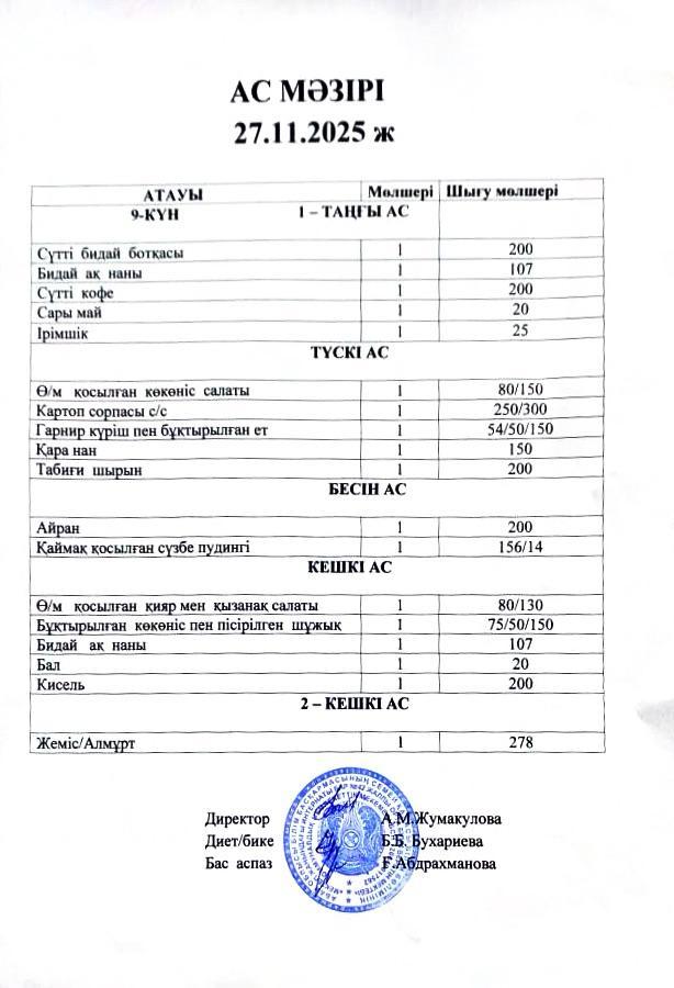 Интернат тәрбиеленушілерінің 27.11.2025 бойынша ас мәзірі