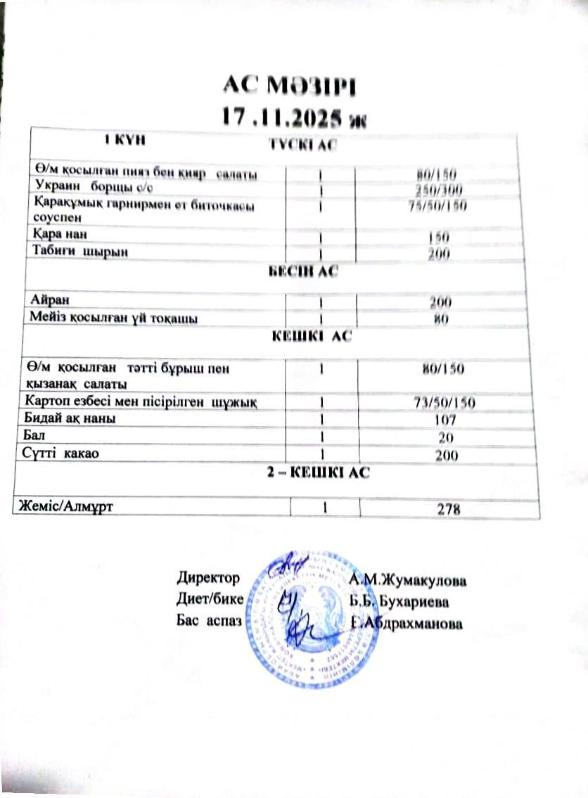 » Интернат тәрбиеленушілерінің 17.11.2025 бойынша ас мәзірі