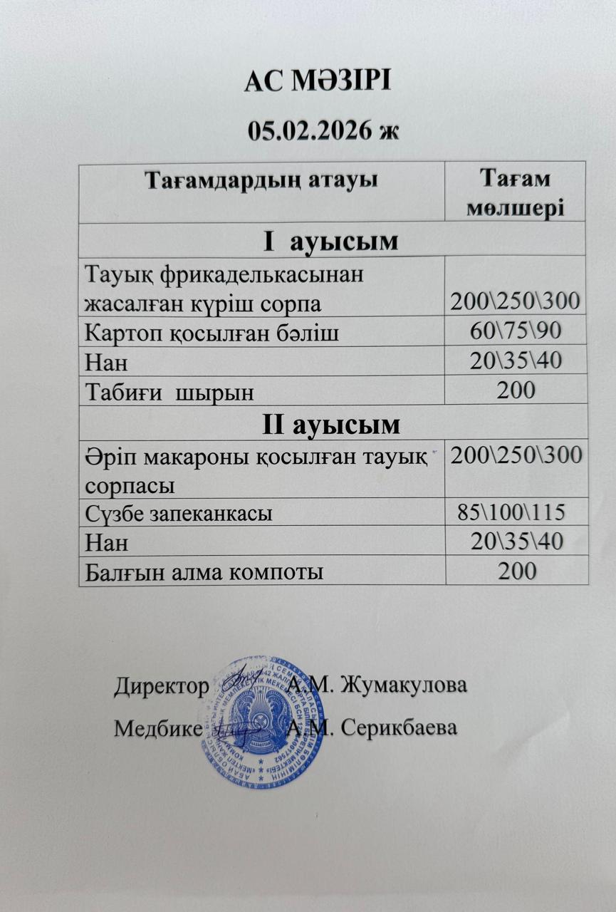 » 1-11 сынып оқушыларына арналған тамақ мәзірі (1-апта; 1,2-ауысым)