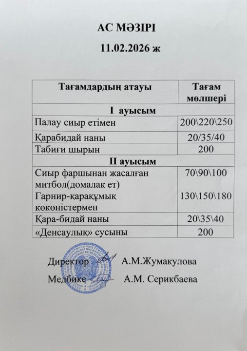 1-11 сынып оқушыларына арналған тамақ мәзірі (2-апта; 1,2-ауысым)