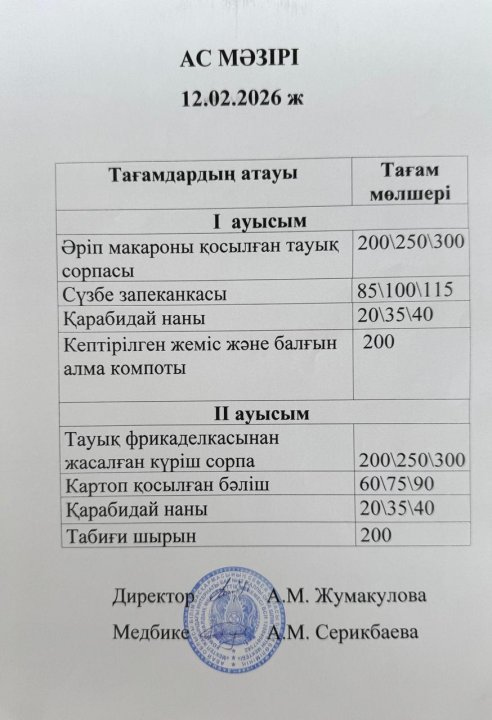1-11 сынып оқушыларына арналған тамақ мәзірі (2-апта; 1,2-ауысым)